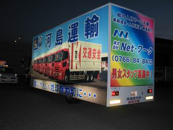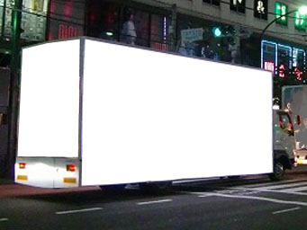 トラックの荷台を利用した光る移動大型看板です。 トラックの荷台部分を大型スクリーンとしてペイントすることで「走る広告塔」を実現!